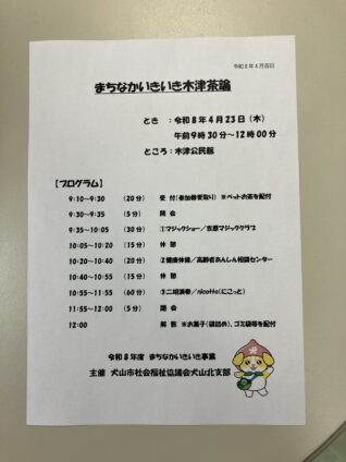 まちなかいきいき木津茶論 令和8年4月23日(木) つどいの場 令和8年度まちなかいきいき事業の1回目が木津公民館で 開催されました。 マジックショー、健康体操、二胡演奏と 充実した内容で大盛況に終わりました。