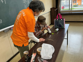 今回は近所の方で、ものづくりが得意な方を講師に招いて、空き缶を使った駒づくりを行いました。