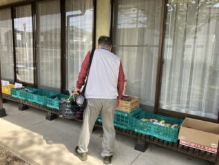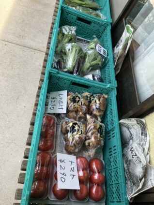 縁側に並んだ野菜や果物を近隣から歩いて来られたお客様が購入されていました。