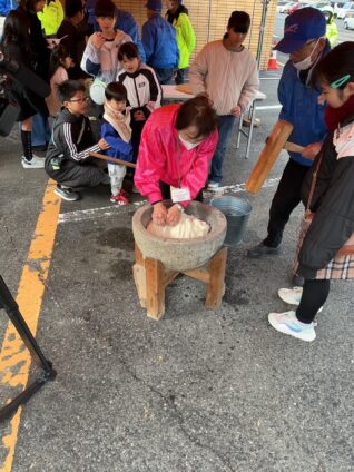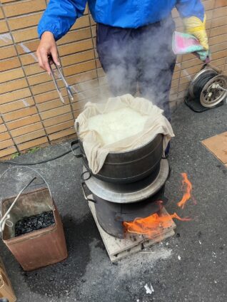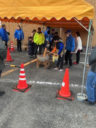 羽黒小学校の5年生が収穫した餅米が使われていて、育てた生徒の皆さんが自分たちが育てた餅米をつきに来られていました。